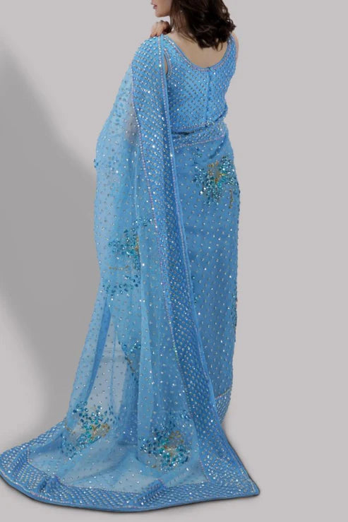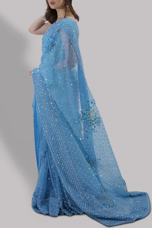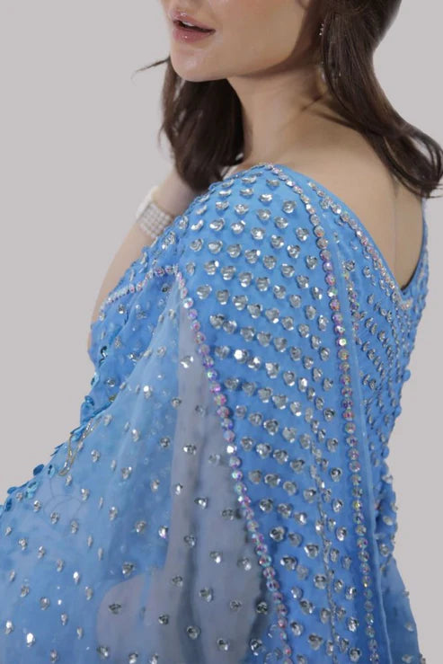 BONNIE BLUE ORGANZA SARI WITH MATCHING EMBELLISHED CROPPED BLOUSE. HAND EMBELLISHED WITH FRESHWATER PEARLS, INTRICATE GLISTENING SEQUIN WORK, DAZZLING CRYSTALS AND GOLD BEADS. THIS SENSATIONAL SARI IS NO EXCEPTION. THIS IS A THREE PIECE LOOK. THE SARI HAS STITCHED PLEATS FOR EASE OF WEARING. MATCHING STITCHED UNDERSKIRT INCLUDED.