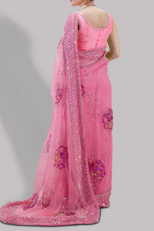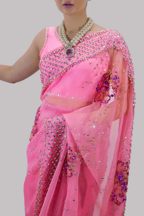 SACHET PINK ORGANZA SARI WITH MATCHING EMBELLISHED DUPION CROPPED BLOUSE. HAND EMBELLISHED WITH FRESHWATER PEARLS, GLISTENING SEQUINS, DAZZLING CRYSTALS AND GOLD BEADS. THIS SENSATIONAL SARI IS NO EXCEPTION.THE SARI HAS STITCHED PLEATS FOR EASE OF WEARING. SILK PETTICOAT INCLUDED.