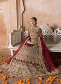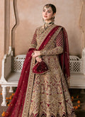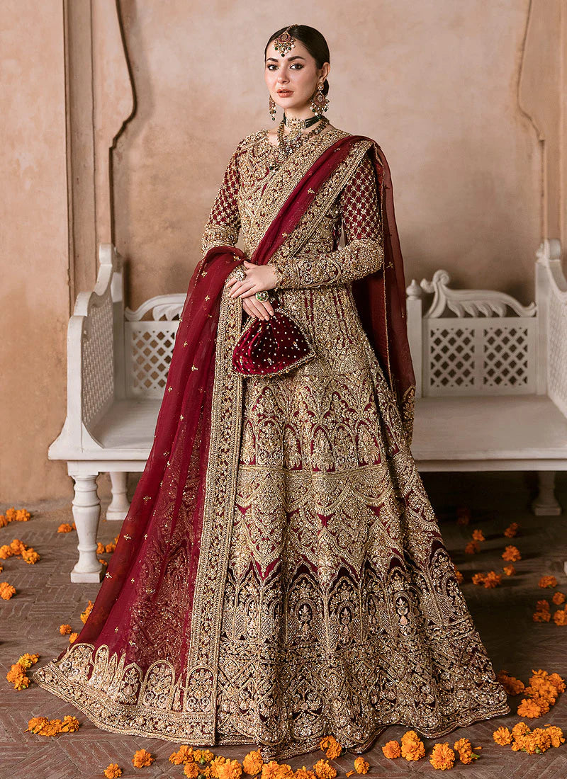 “Muntaha” is a modern silhouette, an epitome of style. The choli has a gorgeously hand embellished with an exaggerated flare of shiny ornaments, such as, naqshi, dabka, crystals, pearls and sequins. Paired with Silk lehanga with heavily embellished border. The look is completed with an organza dupatta with embellished border and extended pallu and spray. This outfit is a fusion of vintage grace and contemporary beauty.