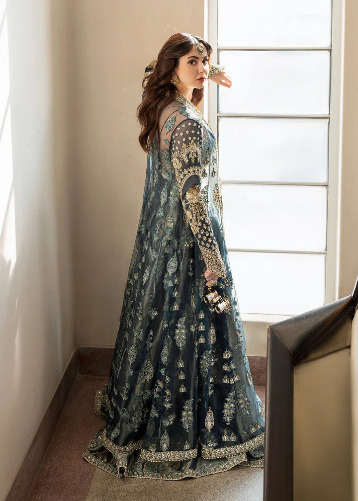 This jacket is embellished and is paired with a blouse. The blouse is adorned with beads and sequins. The jacket is emblazoned with lavish embroidery, dabka, motifs, and resham, making it a perfect choice to create a lavish Pakistani Wedding Dress.