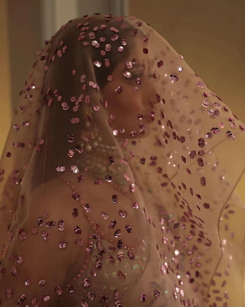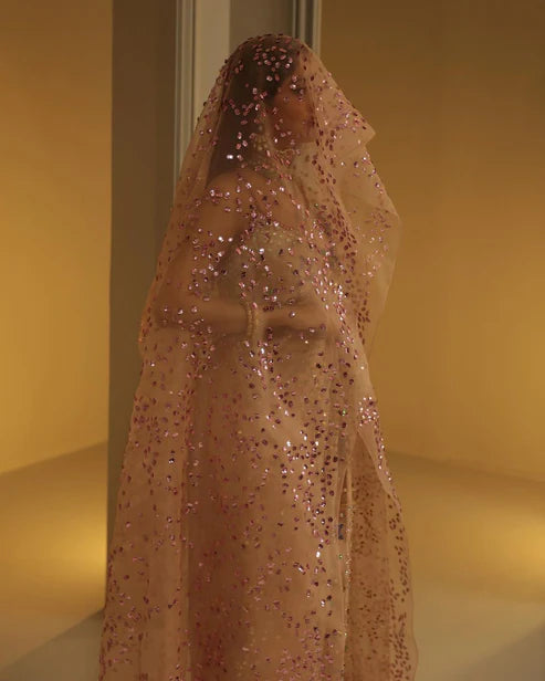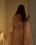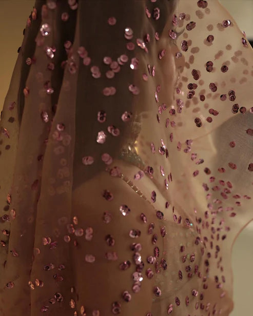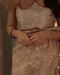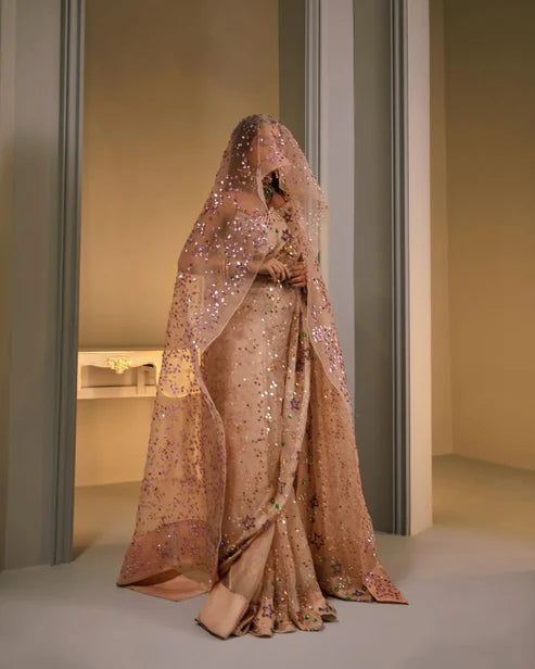 Sajal Ali - Silver Peach Embellished Organza Sari
